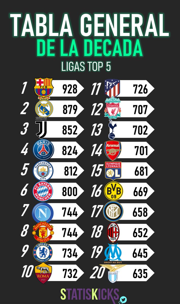 Statiskicks On Twitter Tabla General De La Decada 6 Equipos De Premier League 6 Equipos De Serie A 3 Equipos De La Liga 3 Equipos De Ligue 1 2 Equipos De Bundesliga Barcelona Https T Co Dvpeh7t5wv